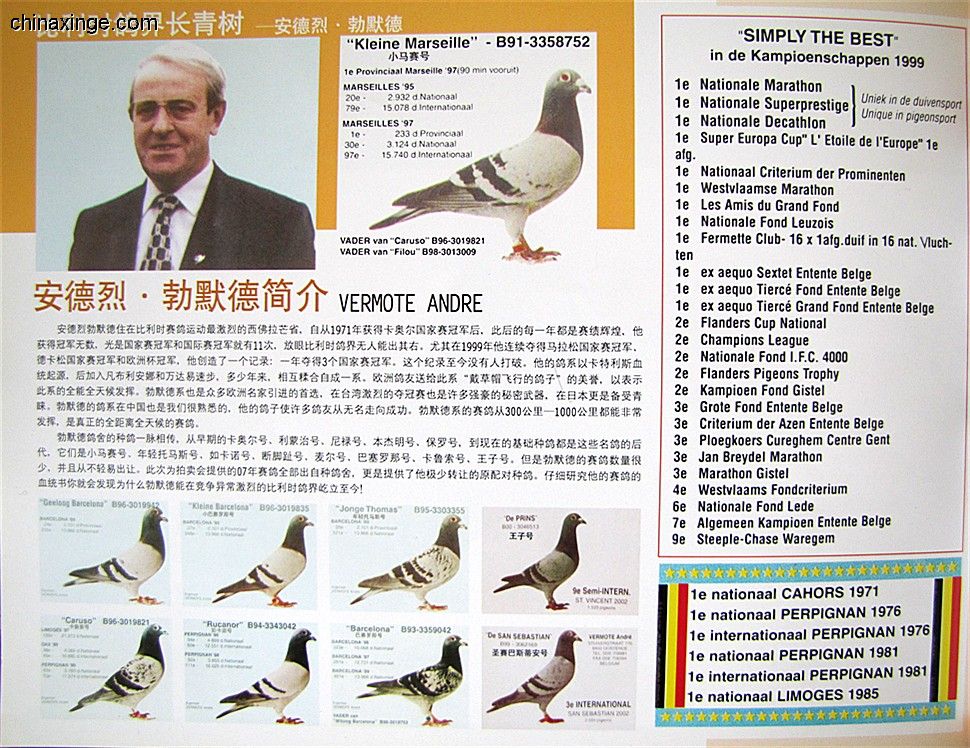 安德烈-勃默德(Andre Vermote),对中国大陆很多鸽友来说,并不是一个陌生的名字,这个品系引进中国比较早,向来是以能吃苦耐劳和能适应各种气候和地形著称。自他荣获1971年卡奥尔全国冠军后,从没有一年成绩不好过;一路走来,叱吒风云40年。他拿过5次全国冠军,其中有二次波品纳国际冠军,放眼比利时鸽坛,谁与争锋?