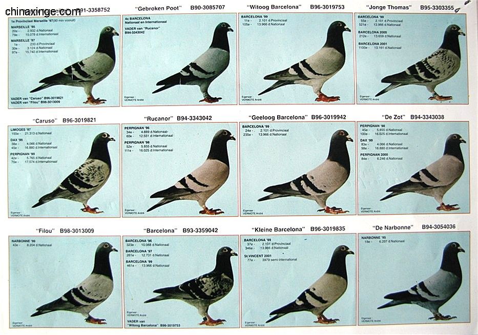 安德烈·勃默德为自己建立起一系鸽族——强夺者朝代(Wringer—Dynasty),这一切全靠一对超级配对鸽.说起安德烈-勃默德的养鸽史,说来也是有点偶然因素。勃默德家族本身并没有任何人是鸽友,只因为住在乡下,有个名叫卡斯特兰的面包师每天上门来卖面包,此人大概也是一个满腔热诚有传教士气质的“鸽教”鸽友,他每天来送面包,也就每天会提起他的鸽子,因此勃默德先生受其感染,也就在1964年从他家拿了四个蛋,开始养起信鸽来。三十多年过去后,勃默德先生在鸽坛上久负胜名,而这位面包师除了勃默德以外鲜为人所知。 这位面包师的鸽子主要是卡特列斯血统。1967年,勃默德先生又从专养万达-易速步(Vander Espt)的莫利斯-万德维尔德引进种鸽,其中一羽雌“小斯波特号”(T‘spreeuwtje,B67-3447594),与从面包师那里拿来的四只蛋出的一只“老灰号”(Oude blauwen, B64-3198093),成为70年代的最佳种鸽配对。 其直子“强夺者”(Wringer,B68-3311745),在1971年获得了780公里卡奥尔国家赛冠军。另外“强夺者号”的姊妹,很多成为超级种鸽。如获得1981年波品纳国际冠军的大名鸽“尼禄号”(Nero,B78-3094650),其母亲就是“强夺者号”的姊妹,“尼禄号”的父亲是凡布利安娜“巴赛罗那一号”直子。“强夺者号”的平辈和其子代,多年后形成了勃默德家族的一基础血线“强夺者线”。另外“强夺者号”的半兄弟与一只从德尼斯兄弟那里引进的雌鸽,出的一羽“阿特利特号”(Atleet,B68-3311730),获得了1971年比利时国家长距离锦标赛亚军,“阿特利特”的平辈和其子代,形成了勃默德家族的第二条基础血线“阿特利特线”。这两条基本血线,奠定了勃默德鸽舍成功的基础。 1976年,勃默德鸽舍的一羽“波品纳号”(Perpignan,B71-3245249),获得波品纳国际冠军,他的父亲就是“强夺者号”兄弟的儿子,母亲是来自其它血系,是万达-易速步 X 斯翠克鲍特。同年,勃默德鸽舍的一羽“圣维仙号”(De St.Vincent,B74-3239790),获得了圣维仙国家赛三名,他的父亲是“强夺者号”的兄弟。1977年,获得巴塞罗那国家赛七名的一羽“巴塞罗那号”(Barcelona,B74-3239808),他是“强夺者号”直子。获得1982年波品纳国家赛第四名的“保罗号”(Paul,B79-3070167),是“强夺者号”的外孙。 八十年代初,勃默德提供给老凡布利安那一只雌鸽,老凡布配上自己一只雄鸽,这个配对产蛋后,第一只蛋给老凡布,第二只蛋给勃默德,它后来成为一只母鸽,其直子“利蒙治号”(De Limoges,B84-3053330),1984年获得利蒙治当岁鸽国家冠军。“利蒙治号”的父亲是“强夺者号”的曾孙。1988年,“利蒙治号”的直子“本杰明号”(Benjamin,B86-3023790),获得了890公里拿波内国家赛亚军,1990年,它又获得波品纳国家赛45名。 “本杰明号”的一羽杰出孙代“马赛号”(De Marseille,B91-3021293),获得94年900公里马赛国家赛20名,另一羽杰出孙代“小马赛号”(De Kleine Marseille,B91-3358752),获得95年马赛国家赛20名,97年马赛省赛冠军,国家赛30名。“小马赛号”成为勃默德当今至关重要的一羽基础种鸽,它也是99年勃默特鸽舍两羽最佳赛鸽“卡鲁索号”(Caruso,B96-3019821)和“福禄号”(B98-3013009)的父亲。 “卡鲁索号”获得1999年880公里达克斯国家赛38名,国际赛45名;1999年波品纳国家赛42名,国际赛70名。福禄号获得99年拿波内国家赛8204羽的43名。“巴塞罗那号”是“保罗号”最后一个直子,它获得了99年巴赛罗那国家赛461名。“卡鲁索号”和“巴塞罗那号”这两羽鸽子因为都是第一指定鸽获胜,所以它们帮助了勃默特在三大锦标赛取得领先权,赢得了四十多万比朗。