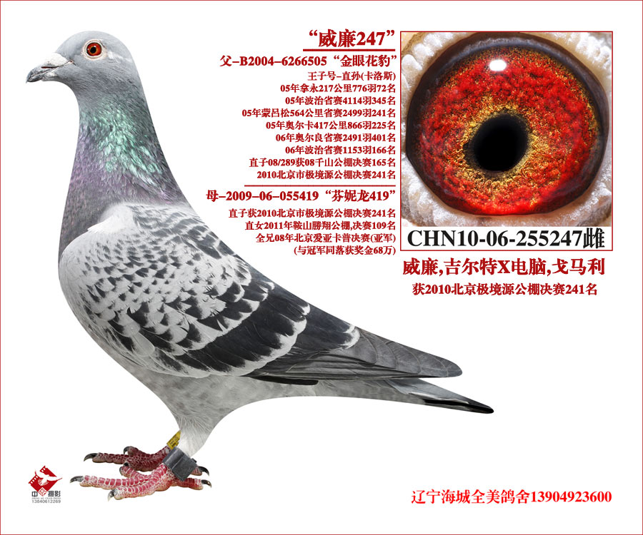 王子号直孙卡洛斯,05年5月15日拿永217公里776羽72名,05年5月28波治省赛4114羽345名,05年6月25日蒙呂松564公里省赛2499羽241名,05年7月16日奥尔卡417公里866羽225名,06年7月15日奥尔良省赛2491羽401名,06年7月29日波治省赛1153羽166名,直子08/289获08千山公棚预赛94名,决赛165名,2010北京市极境源公棚决赛241名