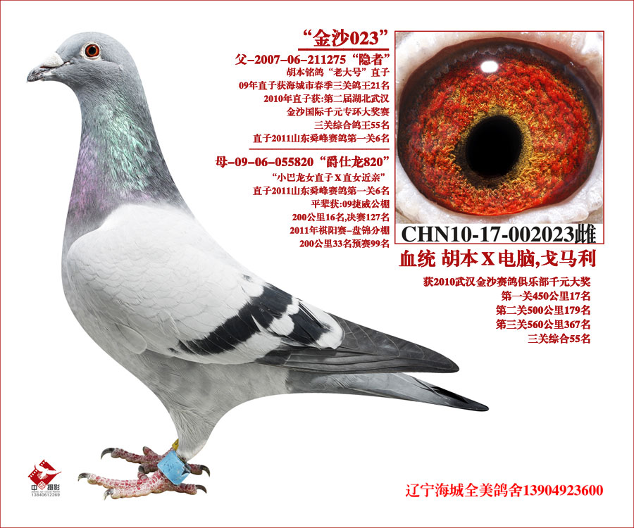 胡本铭鸽“老大号”直子09年直子获海城市春季三关鸽王21名,2010年直子获:第二届湖北武汉金沙国际千元专环大奖赛三关综合鸽王55名,直子2011山东舜峰赛鸽第一关6名