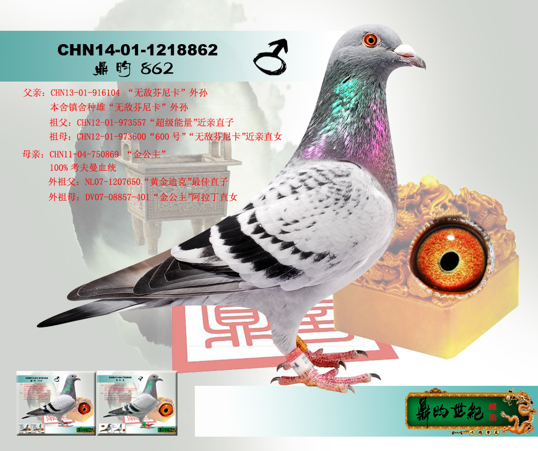德国荣格原舍作出。父亲“阿拉丁”是“小迪克”最好的儿子之一,代表直孙女“法拉迪芭”获荷兰WHZB当日归长距离全国鸽王冠军、西欧杯长距离全国鸽王冠军、“最高荣誉”全国长距离鸽王冠军。被中国阳光家园75000欧元收藏。