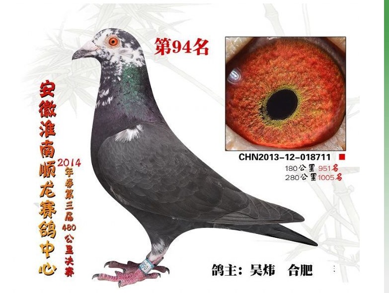 赛绩:14年淮南顺龙春棚决赛94位,当天天气炎热仅归巢123羽。