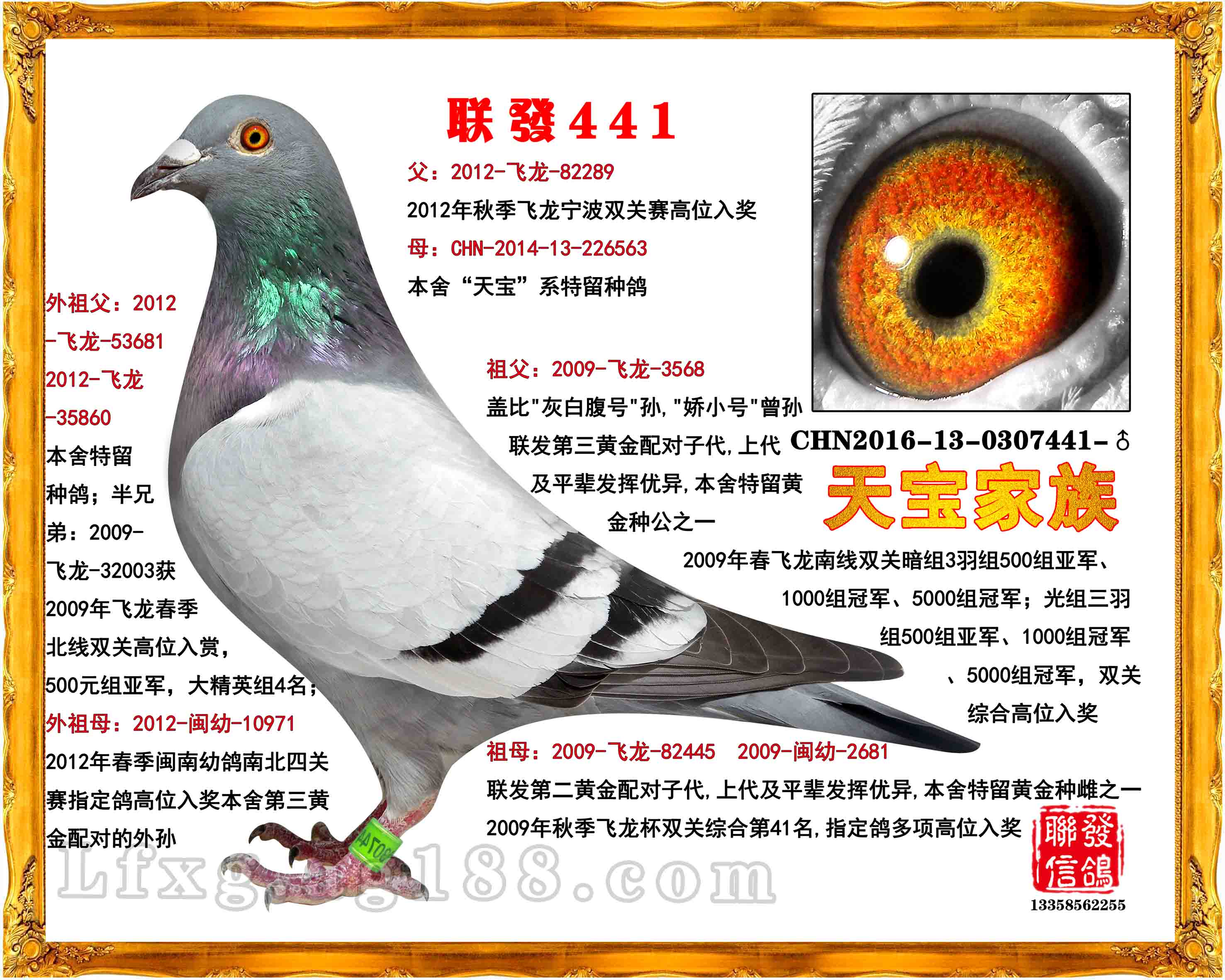 赛绩:天宝家族直系子女,平辈及上下代发挥优异,实战性强,在艰难多关赛事极其突出,横扫千军,弹无虚发,遗传稳定性极佳