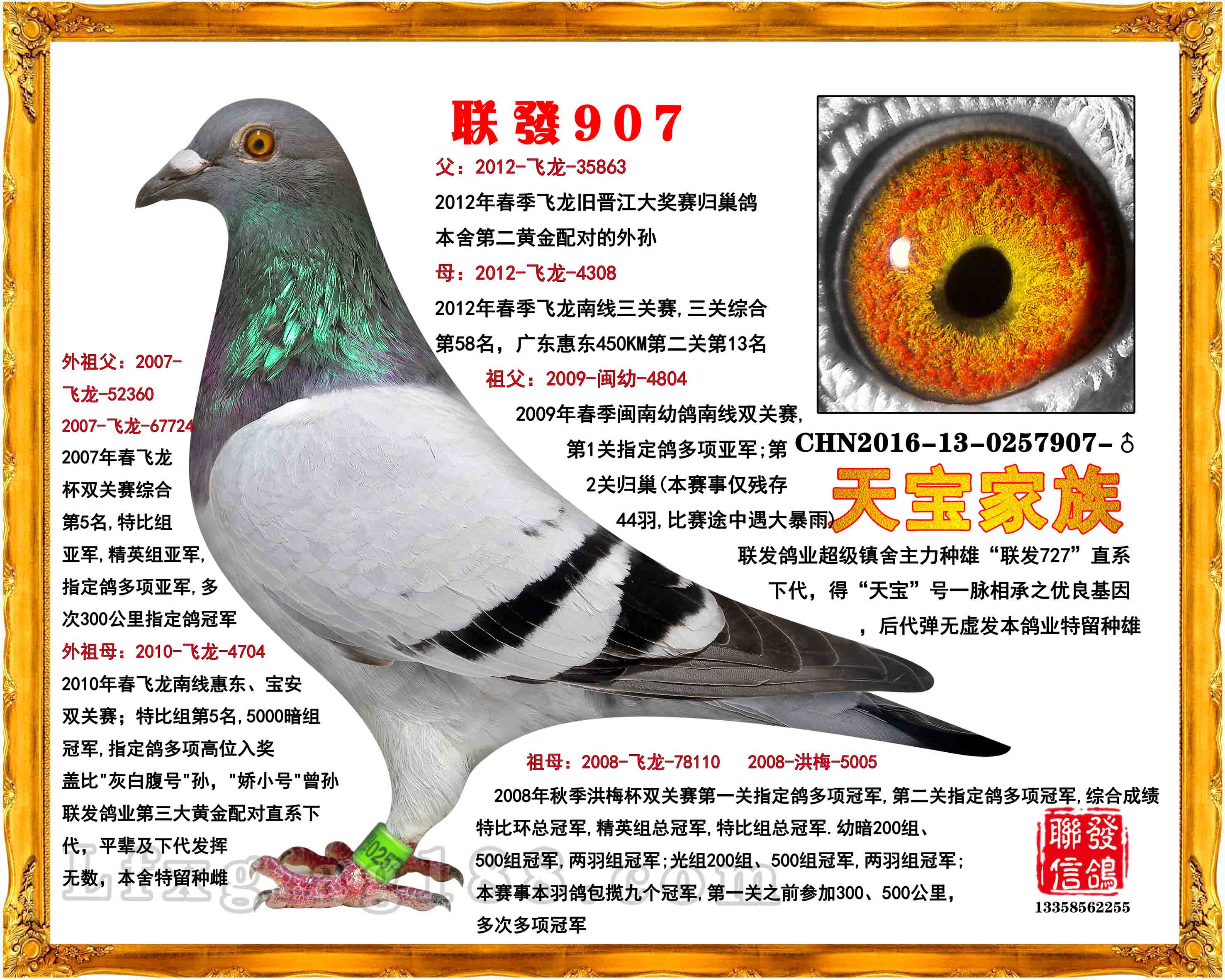 赛绩:天宝家族直系子女,平辈及上下代发挥无数,实战性强,吃苦耐劳之特性,横扫千军,弹无虚发,在艰难多关赛事极其突出,遗传稳定性极佳