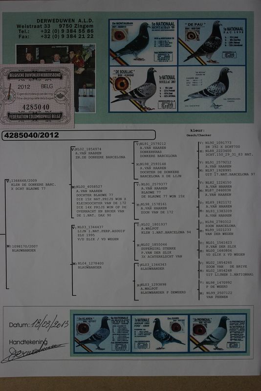本舍于1997年北京市石景山鸽展引入4羽德维.杜万原棚种鸽,BELG-1997-4533039,BELG-1996-4271176,BELG-1996-4171925,BELG-1995-4597286.此系后代在本舍各类比赛300-880公里超强发挥,获奖无数。本舍司翠克鲍特系由此而来。鸽界强豪德维.杜万先生于2013年5月1日凌晨5点因病不幸辞世,享年81岁。我鸽舍在德维.杜万先生去世后,用重金引进了德维.杜万先生在六十年养鸽生涯最后的几年时光中所培育的优秀种鸽。现将21羽杜万种鸽展示给大家。来自比利时辛郡地区的德维.杜万,曾获得2002年K.B.D.B长距离鸽王冠军,2010年欧洲鸽王冠军。2010年K.B.D.B超长距离鸽王全国冠军。德维.杜万是以司翠克鲍特和万德.维根鸽系为基础,这些优良血系溶血性很好。在世界最激烈的赛鸽地都有强势发挥。他从未自掏腰包付钱做广告,而是用成绩来赢得声誉。比赛相当艰苦,恶劣气候也是杜万鸽子所擅长。早熟和距离长短都不是问题。这样的鸽子应该是所有鸽友们心中梦寐以求的。