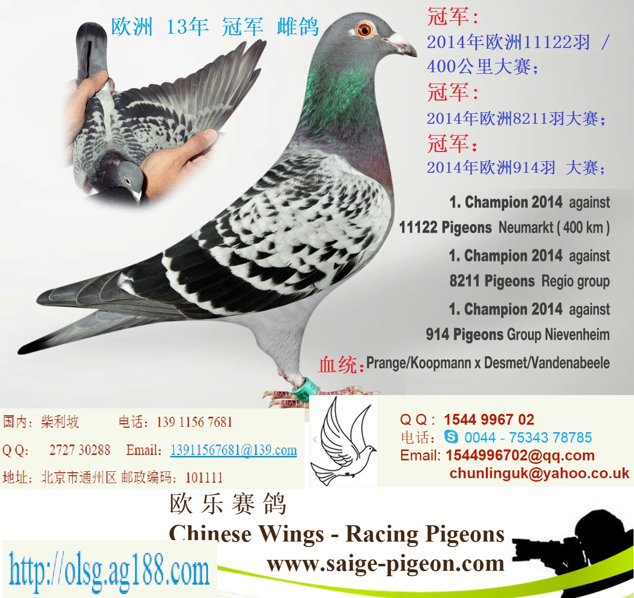 冠军:2014年欧洲11122羽 / 400公里大赛;