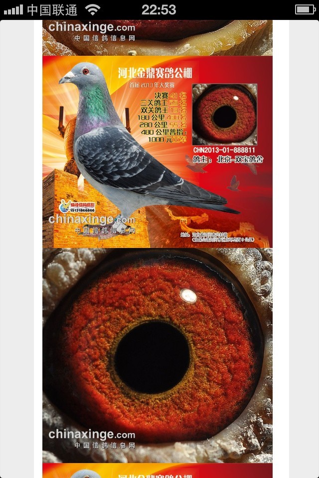 此鸽13年河北金鼎预赛55决赛41指定鸽1000元亚军。此鸽平辈河北宏金鸽王亚军,13爱亚卡普116名