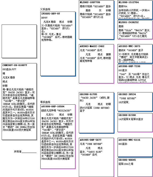 母-著名凡龙大铭鸽“维寇杰克”(WACKO JACKO) 直女,坎贝尔亲自作出优秀种鸽.“维寇杰克”是著名凡龙基础种母“083母”,“梦女孩”(DREAM GIRL)的胞兄,后代获87次1名。目前在美国“维寇杰克的子代只有9羽,#10504是其中之一。#10504是坎贝尔引退前亲自作出优秀种鸽,其胞兄作为一岁鸽在99年以7200美元售出#10504直女获04年加州圣地亚哥公棚赛1名,另一直女“塞纳”(DE SENNA)作出加州600英里1500羽大赛冠军