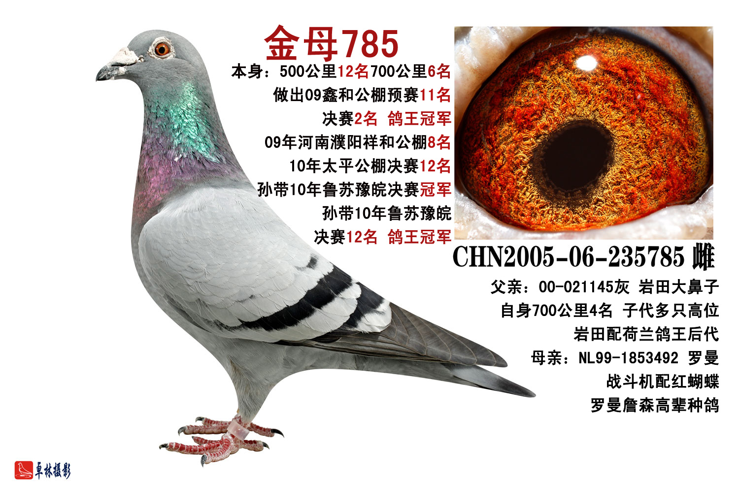 仅11-12年之间本社和朋友处金母785的3代4代5代等都有上佳发挥,冠军就有9羽,前100名数十羽(甚至在我处又一年作为保姆,许多朋友用它飞好后,都告知我,我才再次重用他,果不然确实给我带来极大惊喜)!!!