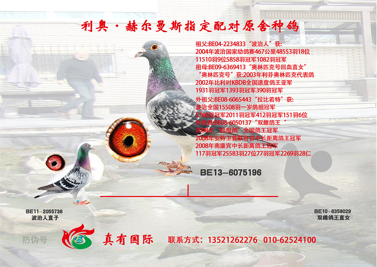 | 名称:利奥“波治人直子”x“双雌鸽王直女” | 环号:BE13-6075196 |
