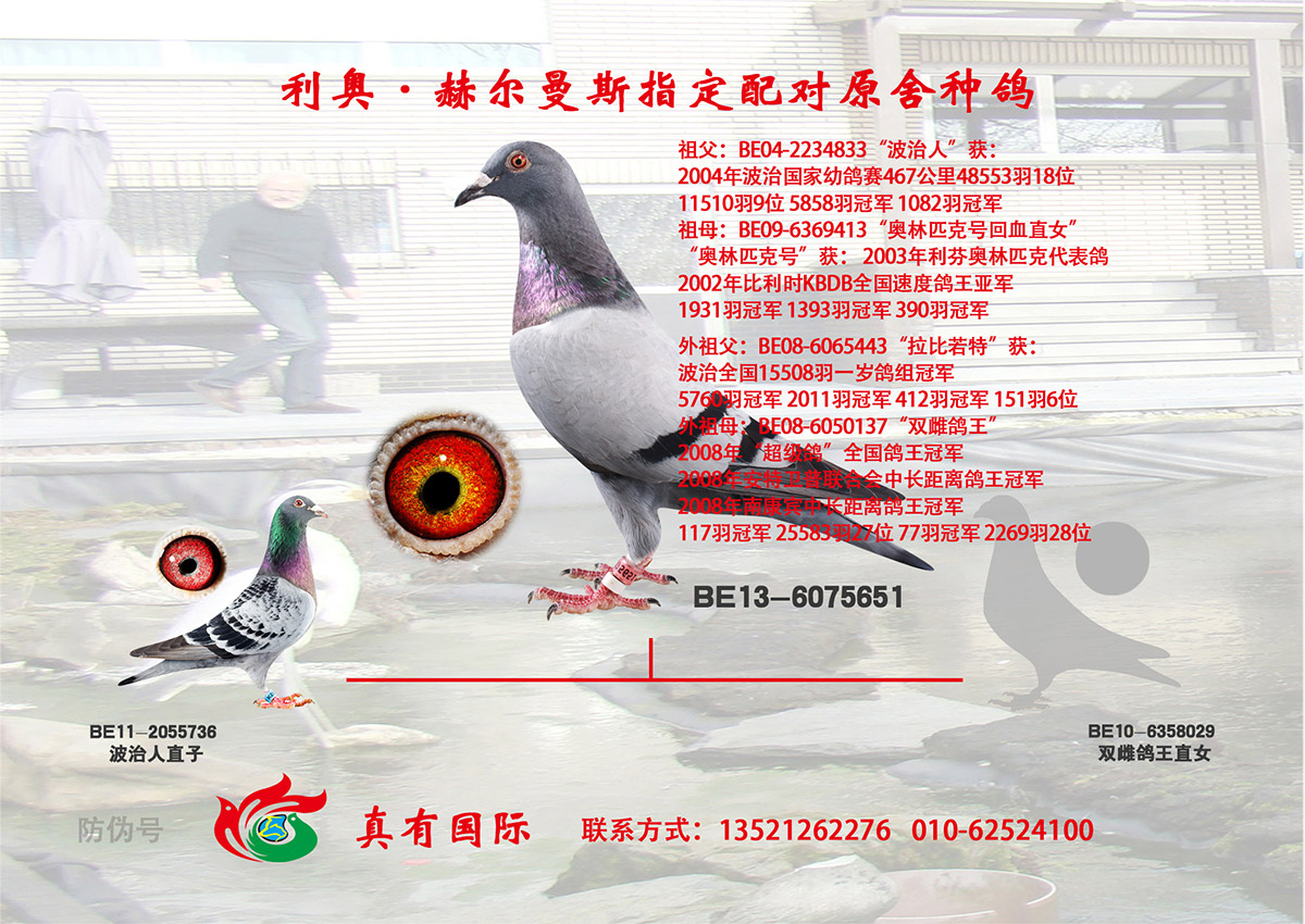 | 名称:利奥“波治人直子”x“双雌鸽王直女” | 环号:BE13-6075651 |