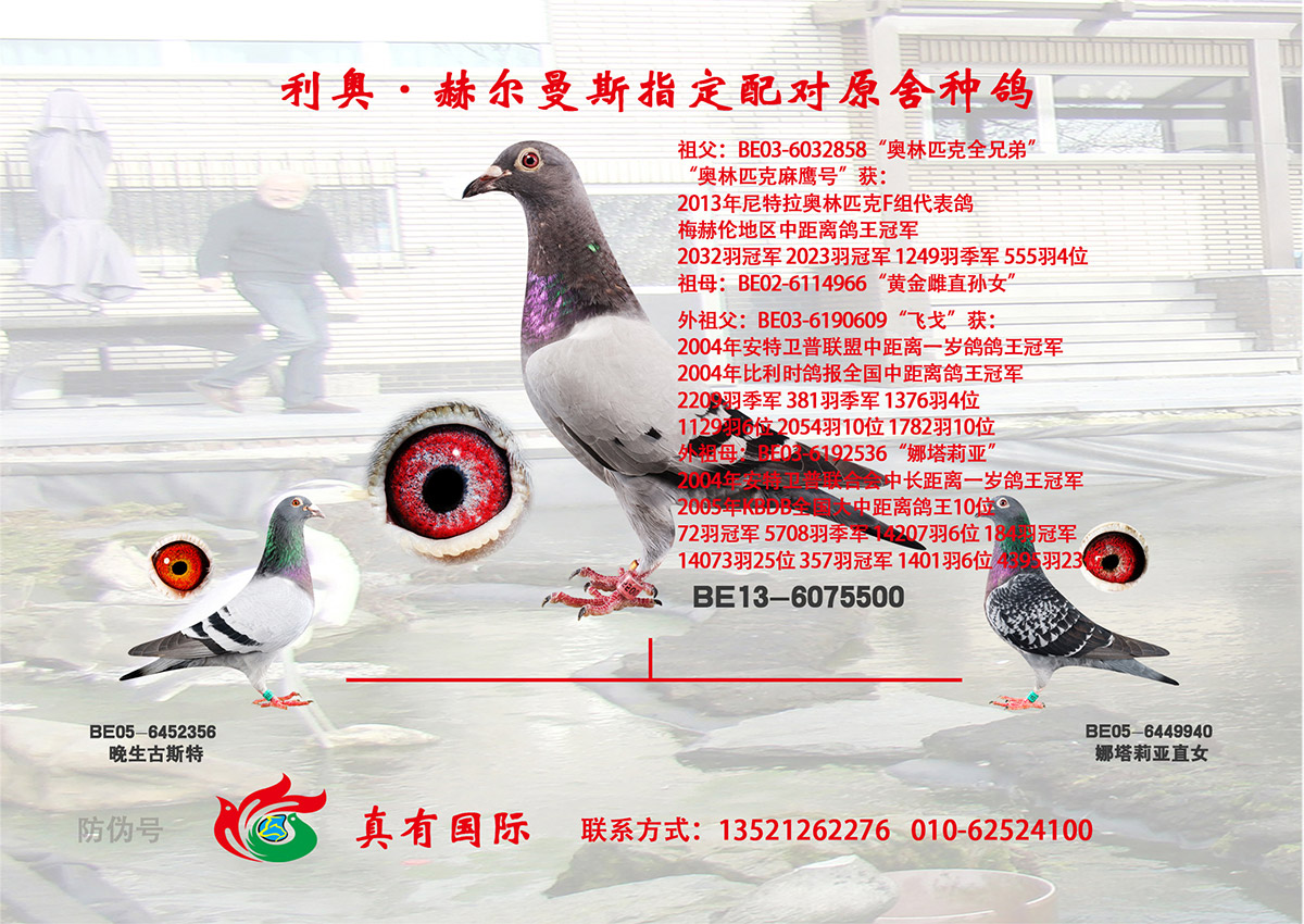 | 名称:利奥“晚生古斯特”x“娜塔莉亚直女” | 环号:BE13-6075500 |