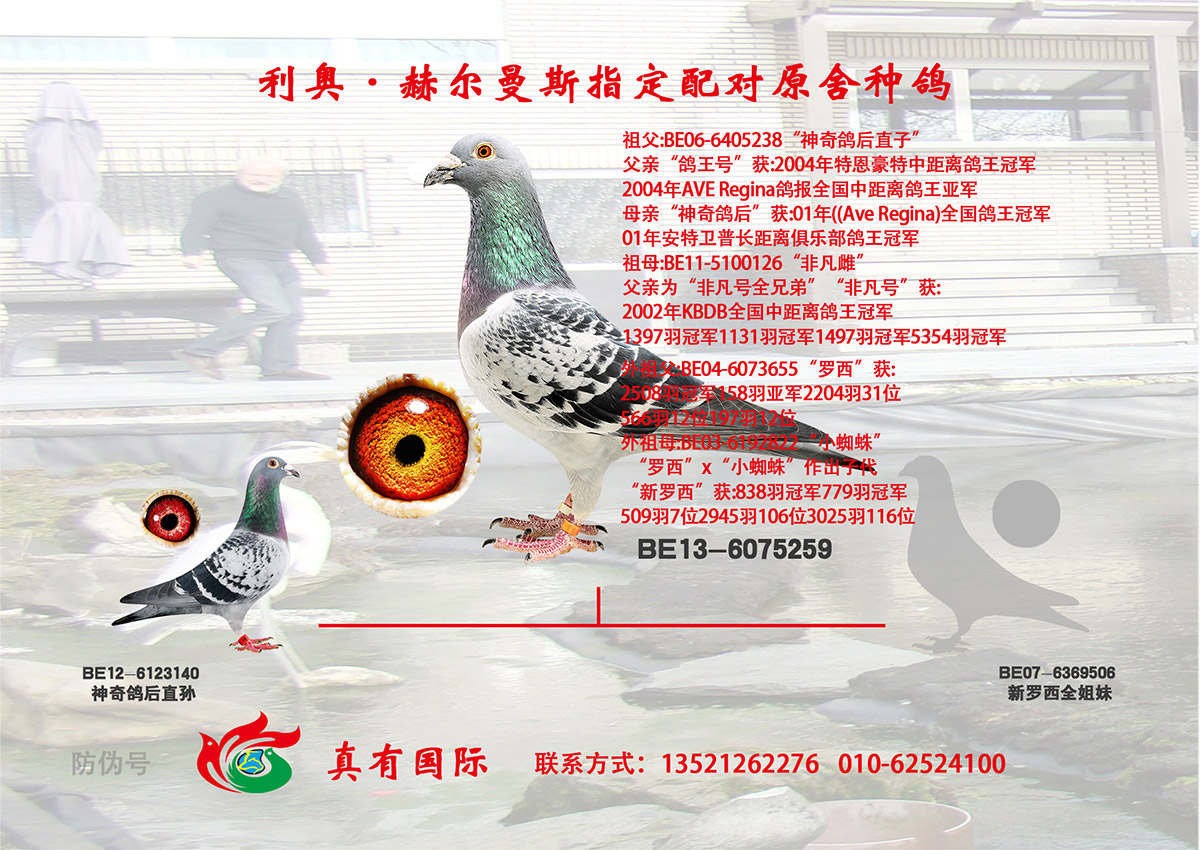| 名称:利奥“神奇鸽后直孙”x“新罗西全姐妹” | 环号:BE13-6075259 |