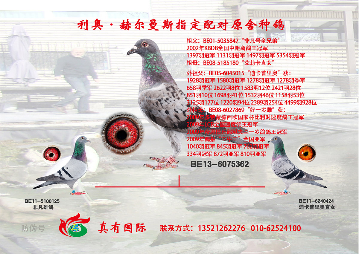 | 名称:利奥“非凡雄鸽”x“迪卡普里奥直女” | 环号:BE13-6075362 |