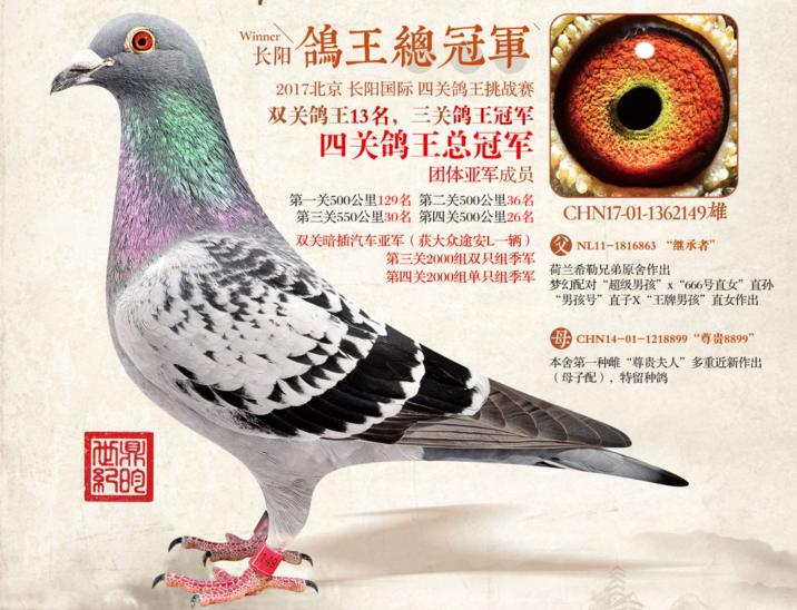 | 名称:长阳鸽王总冠军 | 环号:CHN17-01-1362149 |
