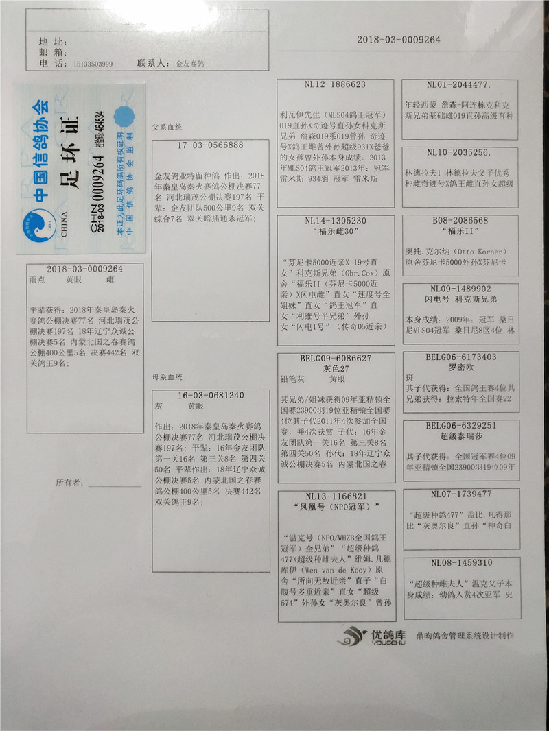 | 赛绩:2018年秦皇岛秦火赛鸽公棚决赛77名 河北瑞茂公棚决赛197名 18年辽宁众诚公棚决赛5位 内蒙古北国之春赛鸽公棚400公里5名 决赛442名 双光鸽王9名 | |