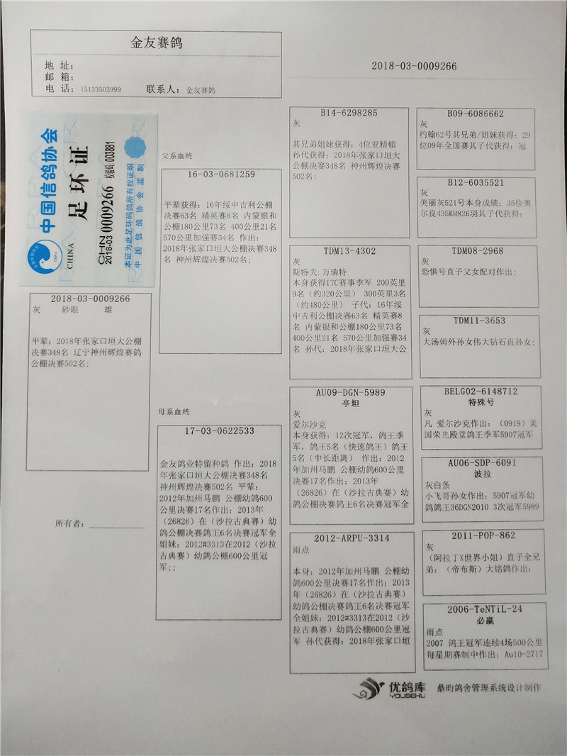 雨点本身: 2012年加州马鹏公棚幼第600公里决赛17名作出: 2013年(26826) 在(沙拉古典赛)幼鴿公棚决赛鸽王6名决赛冠军全姐妹: 20123313在2012 (沙拉古典赛)幼鸽公棚600公里冠军孙代获得: 2018年张家口垣大决赛348名