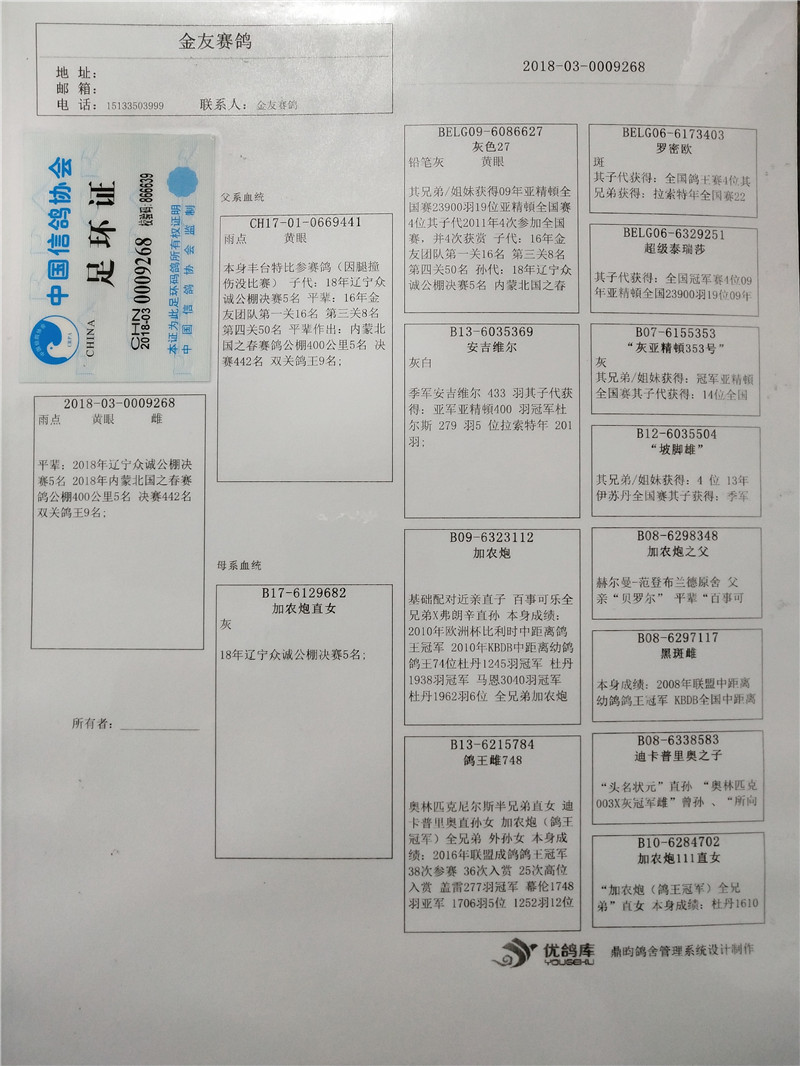 本身赛绩:2016年联盟成鸽鸽王冠军,38次参赛36次入赏,其中25次高位入赏