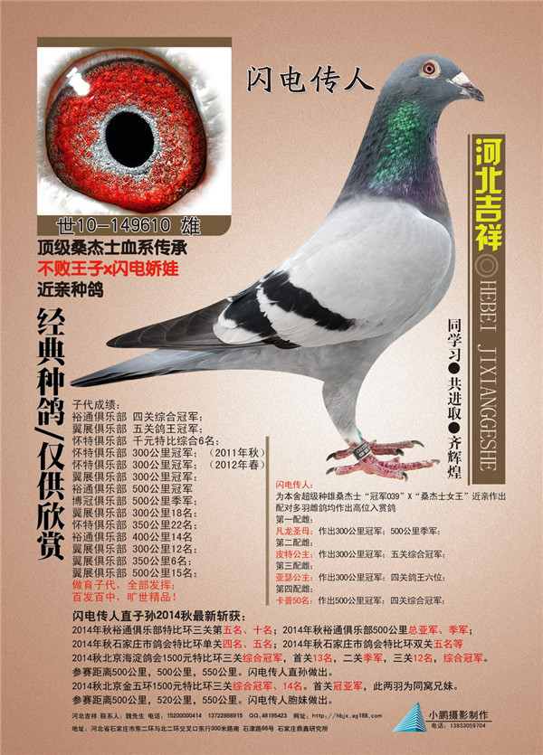 后代:04年秋石家庄市会300公里冠军,05年石家庄市会500公里亚军;06年春石家庄市会300、500、700三关鸽王赛冠军;06年秋石家庄市会300、500、650三关鸽王赛冠军;06年秋金霸公棚预赛冠军;08秋吉祥俱乐部四关赛亚军,指定鸽冠军