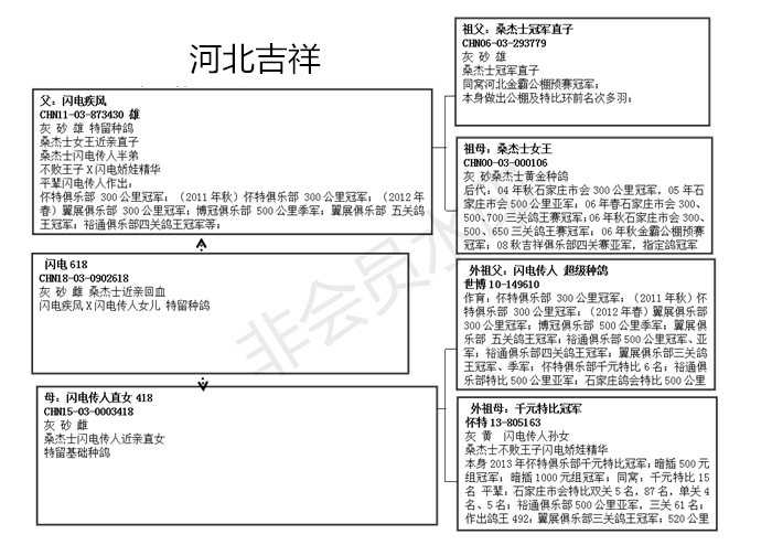 | 赛绩:父亲闪电疾风,特留种鸽,平辈闪电传人作出多个俱乐部冠军、鸽王冠军 母亲特留种鸽、超级种鸽闪电传人直女 | |