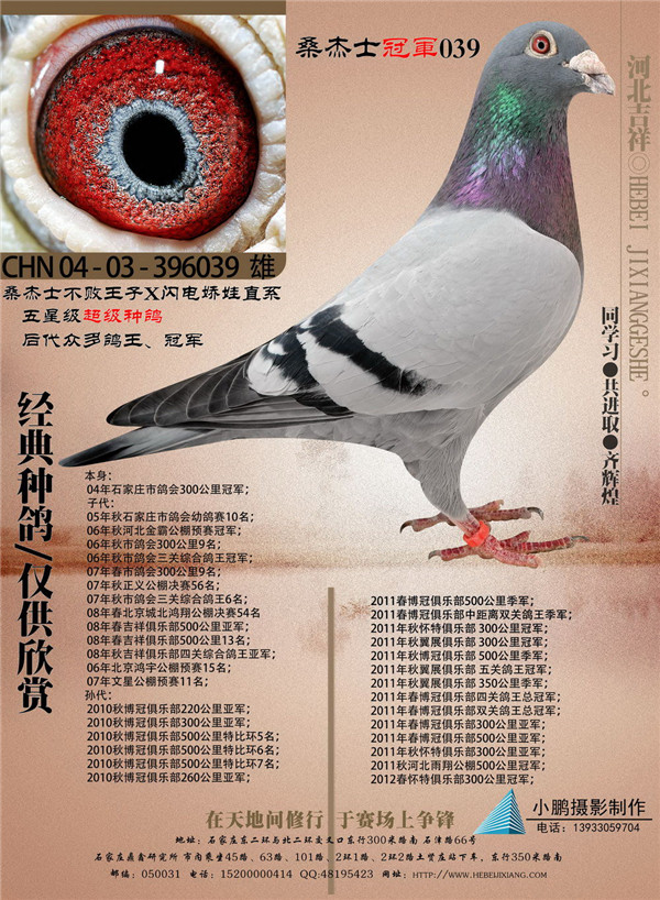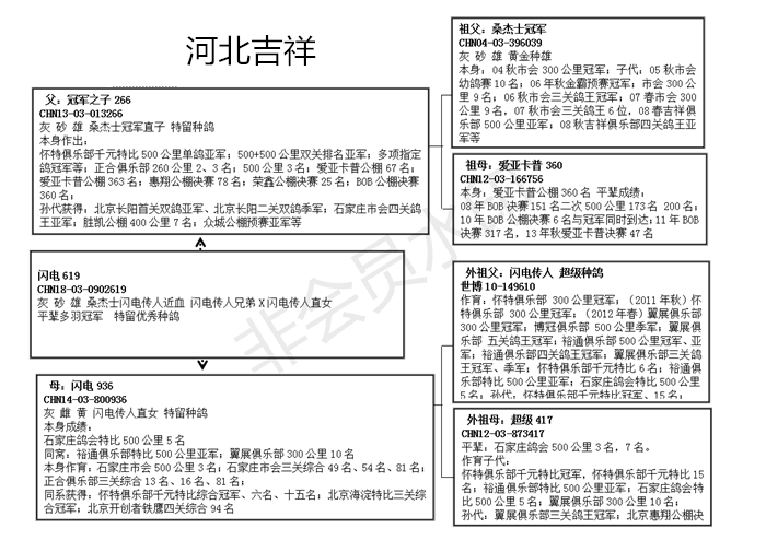 | 赛绩:父亲冠军之子,特留种鸽,作出多羽子代和孙代高位赛绩鸽 母亲特留种鸽,闪电传人直女 | |