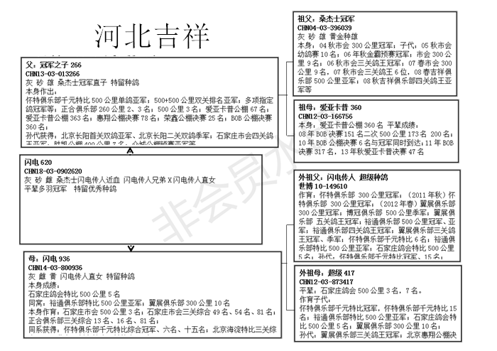 | 赛绩:父亲冠军之子,特留种鸽,作出多羽子代和孙代高位赛绩鸽 母亲特留种鸽,闪电传人直女 | |