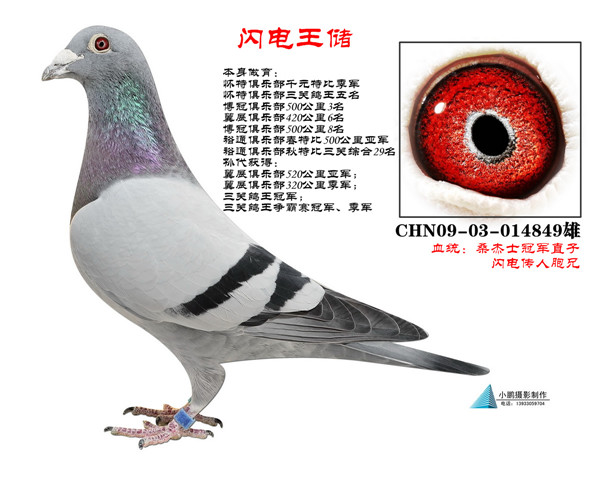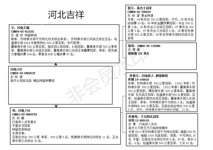 | 赛绩:父亲黄金种鸽桑杰士冠军直子,作育子代双关鸽王季军、三关鸽王5位,孙代三关鸽王冠军 母亲超级种鸽闪电传人直女,作育多羽高位赛季鸽 | |