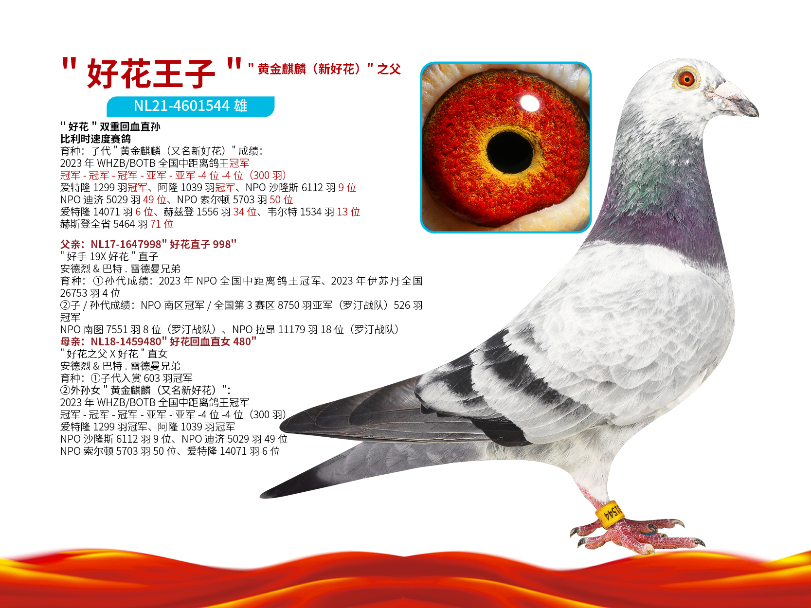 育种:①孙代成绩:2023 年 NPO 全国中距离鸽王冠军、2023 年伊苏丹全国 26753 羽 4 位