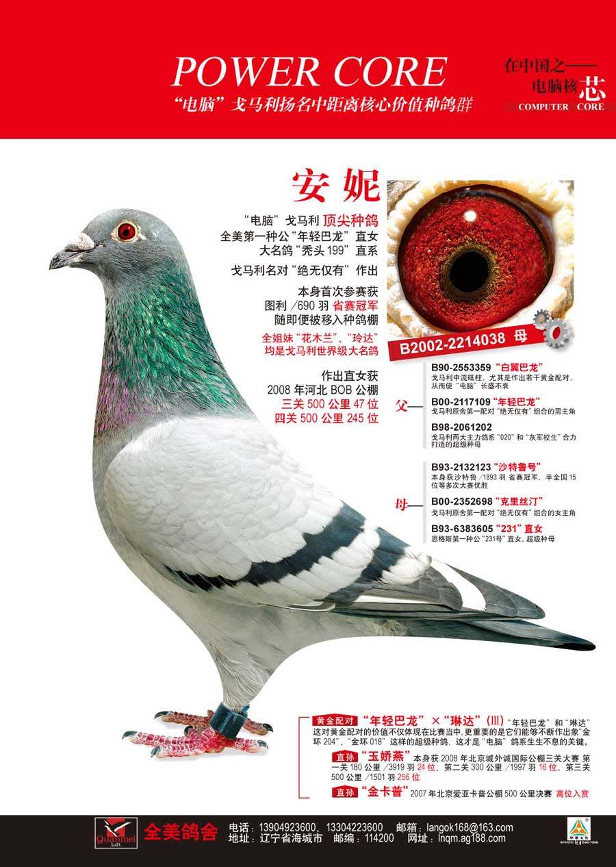 (同窝02-2214039花木兰获9名)其自身优秀的种鸽条件,令戈马利爱不释手立即将其打入种鸽棚,剥夺了她再次夺冠的机会,并以其夫人的名字安妮命名。