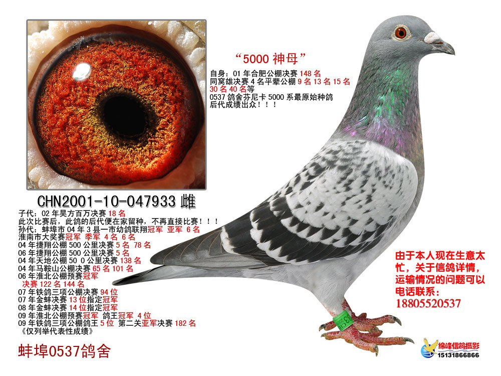 自身:01年合肥公棚决赛148名,同窝雄决赛4名(在金蚌公棚老板易文处)平辈公棚9名13名15名30名40名等。0537鸽舍芬尼卡5000系最原始种鸽,后代成绩出众!!!
