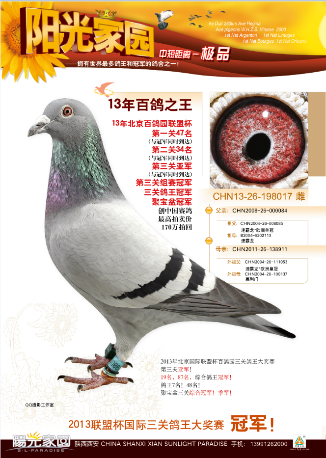 13年北京百鸽园联盟杯,第一关47名与冠军同时到达,第二关34名与冠军同时到达,第三关亚军与冠军同时到达,第三关插组通插冠军,三关鸽王冠军,聚宝盆冠军,以中国赛鸽最高拍卖价170万拍回
