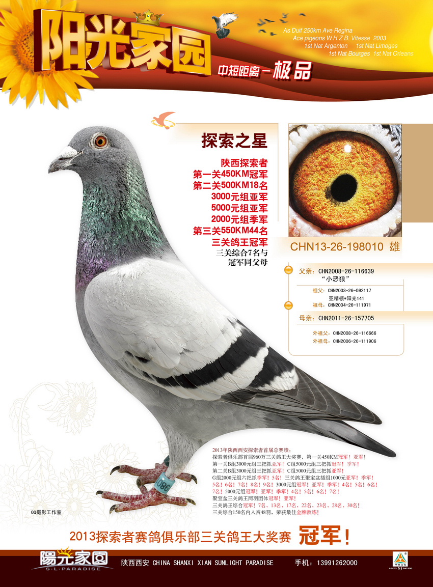 陕西探索者,第一关450KM冠军,第二关500KM18名,3000元组,5000元组亚军,2000元组季军,第三关550KM44名,三关鸽王冠军,三关综合7名与冠军同父母