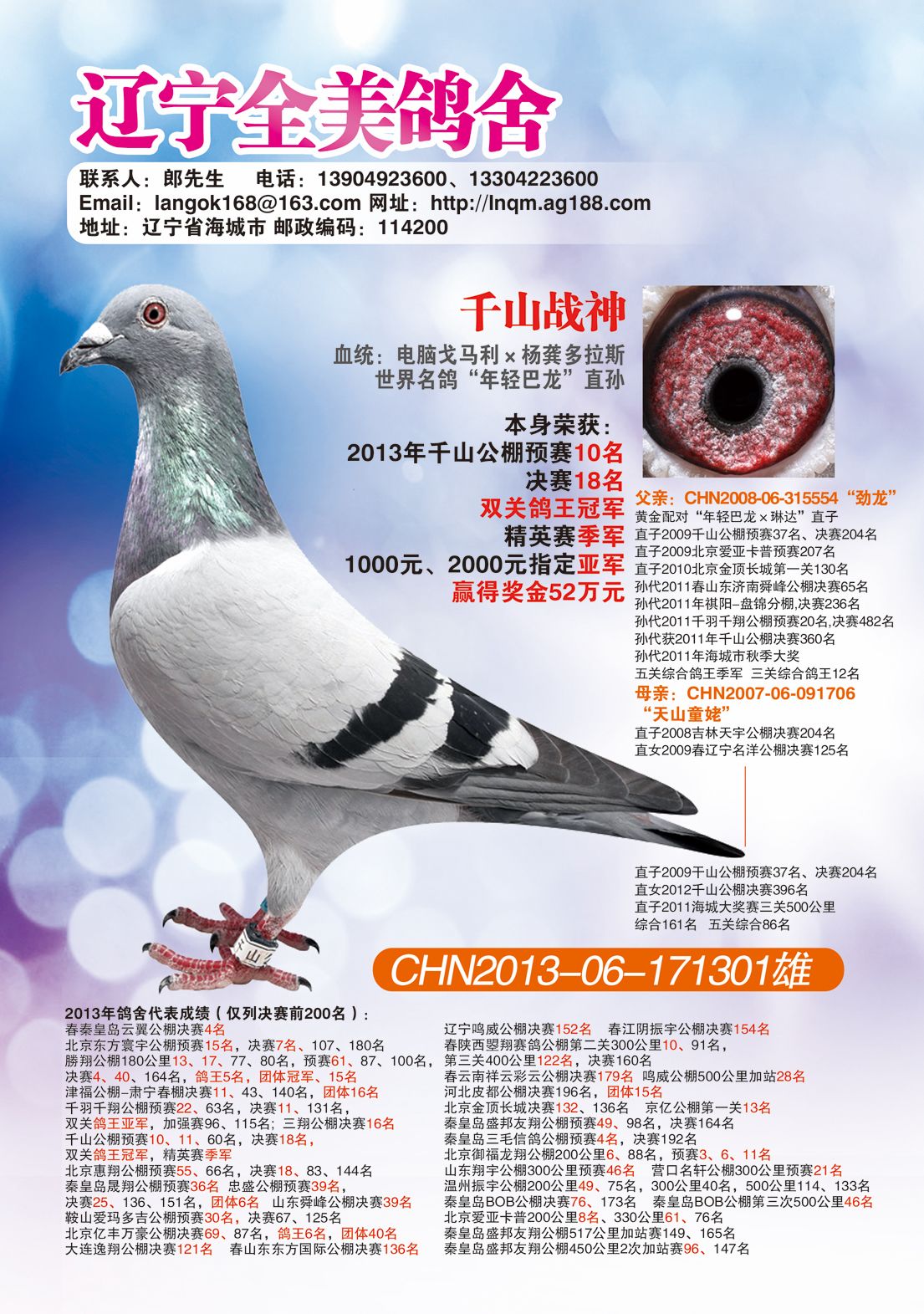 直子获2013年千山公棚预赛10名,决赛18名,双关鸽王(冠军)