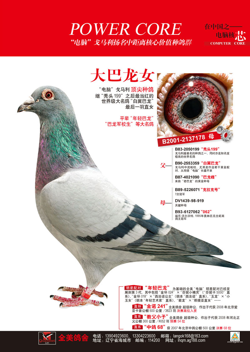 父-“白羽巴龙”B90-2553359是“秃头199”最杰出的直子,作出多羽种赛鸽,代表直子“年轻巴龙”“巴龙军校生”孙女“花木兰”“琳达”“