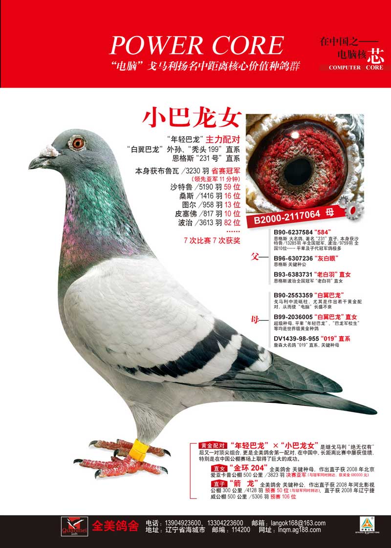 B00-2117064“小巴龙女”(白羽巴龙孙女,年轻巴龙二夫人)代表子代“金环204”“箭龙”子孙代高位入赏多羽