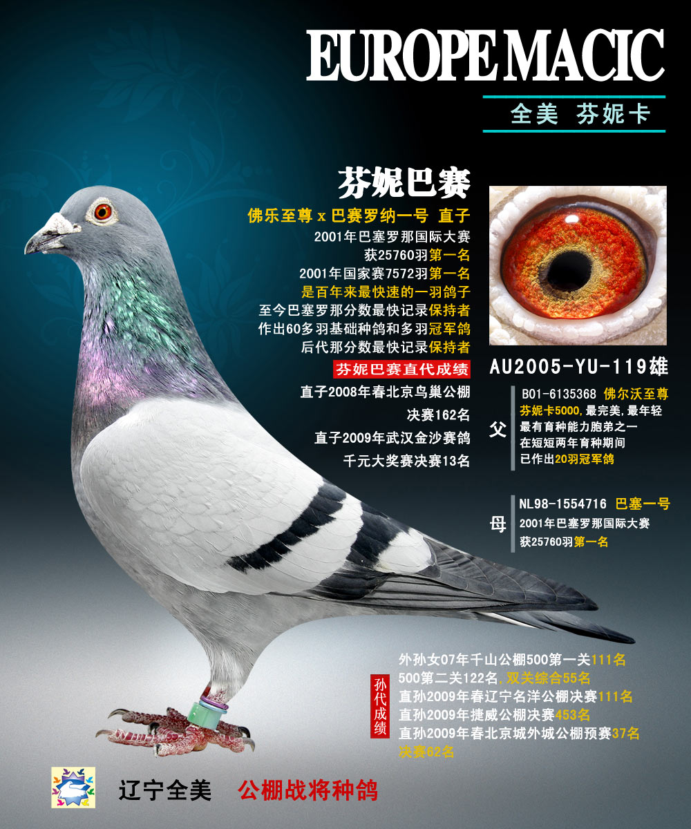AU2005-YUPIGEON-119“芬尼巴塞”,直子获08年春北京鸟巢公棚决赛162名,07年外孙女获千山公棚500第一关111名,500第二关122名,双关综合55名,直孙08/444获09春辽宁名洋公棚决赛111名,09捷威公棚决赛453名,08/267获09春北京城外城公棚预赛37名决赛62名,直子获2009武汉金沙赛鸽俱乐部千元大奖赛决赛13名