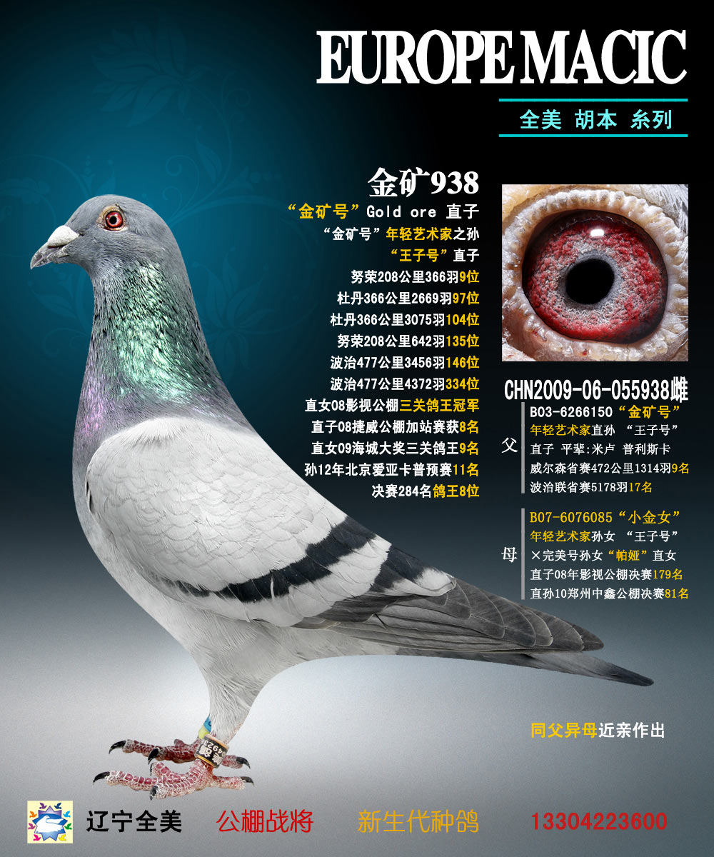 父-BELG2003-6266150“金矿号”年轻艺术家直孙 (直女获08年河北影视公棚三关鸽冠军)本身获得,杜丹366公里,2669羽97位,杜丹366公里,3075羽104位,波治477公里3456羽146位,波治477公里4372羽334位,直孙获2007年春北京城外城公棚决赛冠军)08作育直代捷成公棚加强赛8名,河北影视公棚3关鸽王冠军,直女09年海城特比环三关鸽王9名