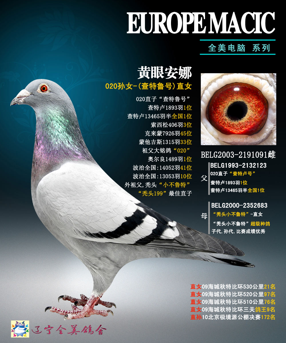 BELG2003-2191091“黄眼安娜”电脑“020”孙女 直女获:海城市2009年秋特比环大奖抚余站530公里21名,大安站520公里97名,白城子站510公里76名,三关鸽王9名