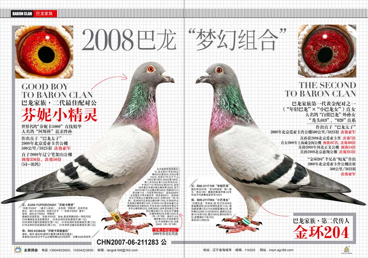 父-B00-2117109 “年轻巴龙”继83年后20年“戈马利鸽舍”唯一能与〔禿头199〕媲美的黄金种雄,02年作出子代参赛冠亚军率100%