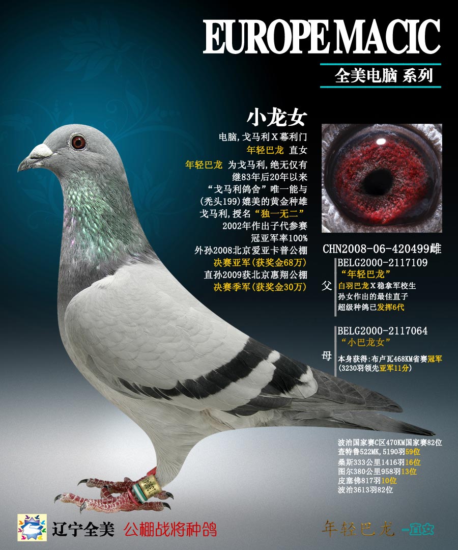 父-B00-2117109 “年轻巴龙”继83年后20年“戈马利鸽舍”唯一能与〔禿头199〕媲美的黄金种雄,02年作出子代参赛冠亚军率100%