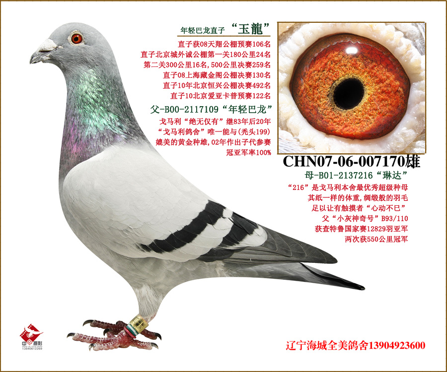 其父是戈马利铭鸽 “小灰神奇号”B93-2132110,本身获查特鲁国家赛12829羽亚军,两次获550公里冠军,5次参加上万羽国家赛,全部入赏,为稳拿军校生,最优秀们孙子“216”是戈马利本舍最优秀超级种母,其纸一样的体重,绸缎般的羽毛足以让有触摸者“心动不巳”戈马利原舍第二黄金配对
