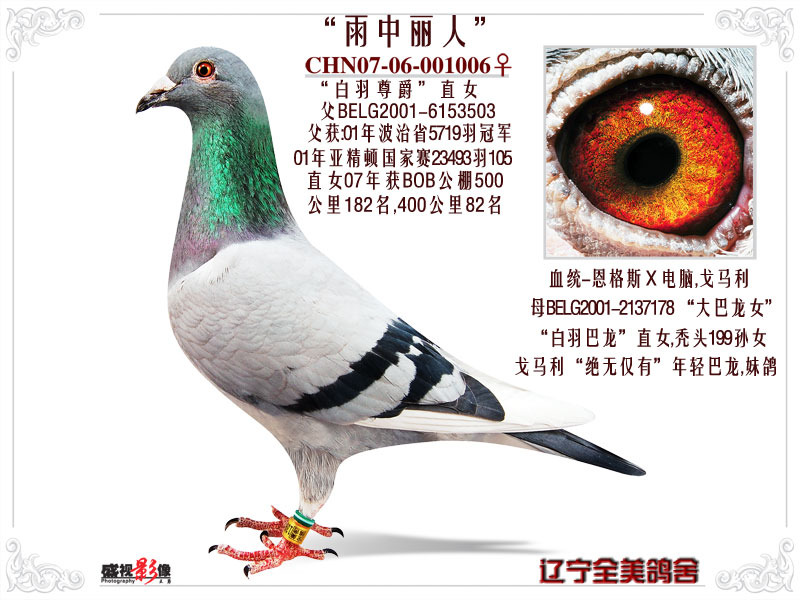 父“白羽尊爵”获:01年波治省5719羽冠军01年波治省5719羽冠军,01年亚精顿国家赛23493羽105位,02年皮赛佛570羽3位,03奥尔良3801羽21位,03年波治国家赛12389羽13位,04波治国家赛B区3844羽57名 直女07年获BOB公棚500公里182名,400公里82名