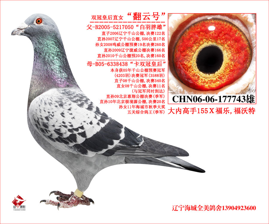 本身获05年千山公棚预赛冠军(4203羽)决赛冠军(3588羽),直女获06北京皇家侨园公棚980万大奖预赛60名,直女获07秦皇岛BOB公棚二关500公里182名,双关500公里93名,133名,直子08千山公棚决赛340名,11名(与冠军同时到达)外孙10年千山公棚预赛20名,决赛160名,直孙10年北京极境源公棚预赛201名决赛20名,孙代09春辽宁名洋公棚预赛25名,决赛111名299名389名,孙代09春北京城外城预赛37决赛62名,11年海城市秋季大奖五关综合鸽王(季军)