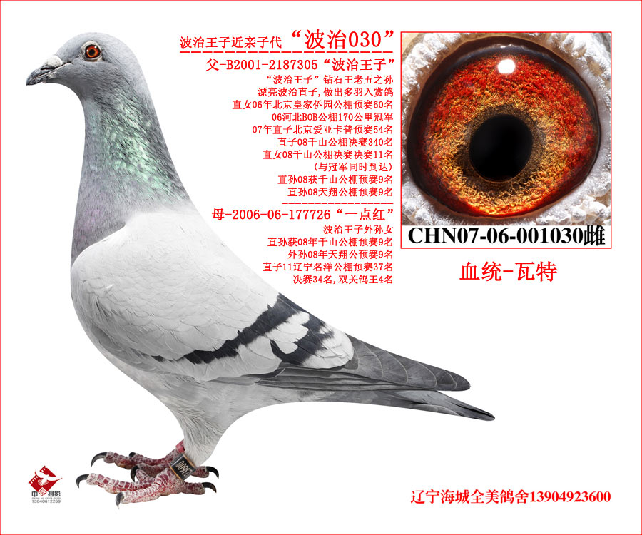 父-BELG2001-2187305“波治王子”钻石王老五之孙,“漂亮波治”直子,做出多羽入赏鸽,子代06年北京皇家侨园公棚预赛60名,BOB170公里冠军,07北京爱亚卡普公棚预赛54名,外孙07辽宁千山公棚500公里17名