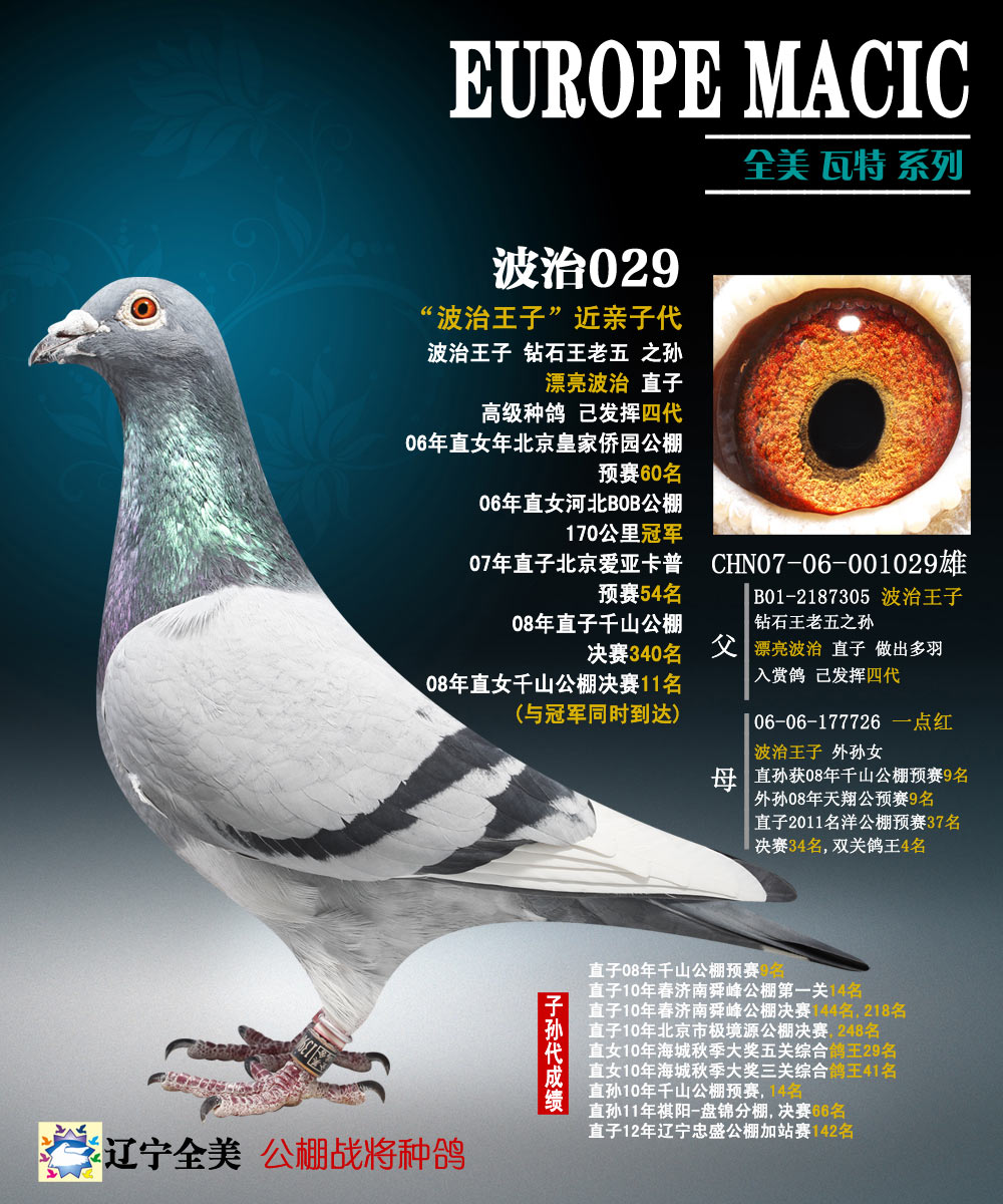 父-BELG2001-2187305“波治王子”钻石王老五之孙,“漂亮波治”直子,做出多羽入赏鸽,子代06年北京皇家侨园公棚预赛60名,BOB170公里冠军,07北京爱亚卡普公棚预赛54名,外孙07辽宁千山公棚500公里17名
