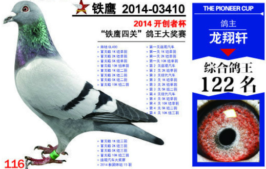 2014年.秋季.特比环.荣获四关综合鸽王.113名。挑战者大奖赛.15名.获奖金100万元.