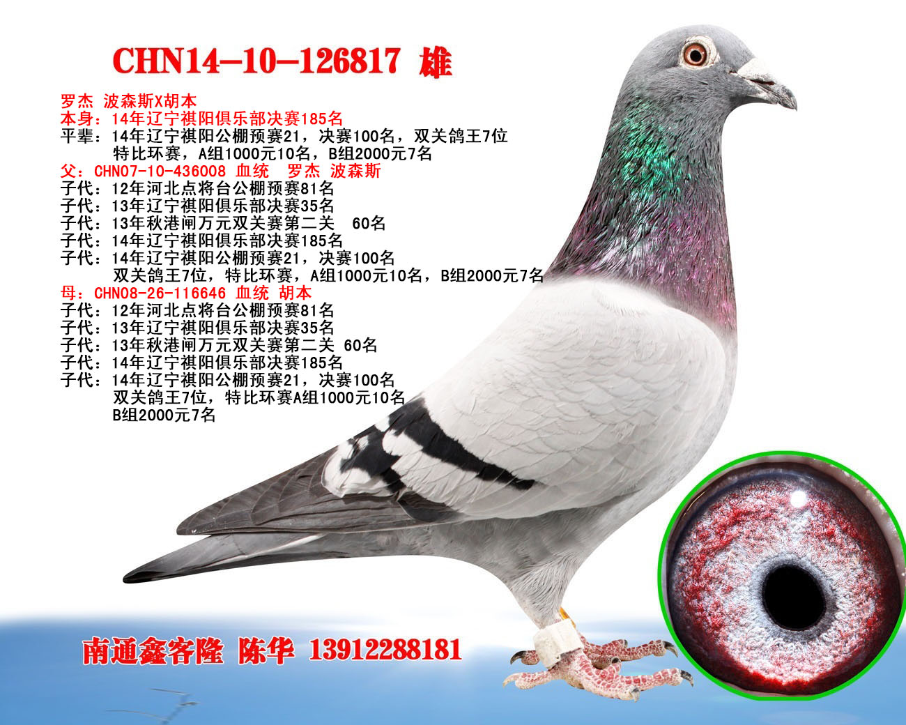 子代:14年辽宁祺阳公棚预赛21,决赛100名,双关鸽王7位,特比环赛,A组1000元10名,B组2000元7名