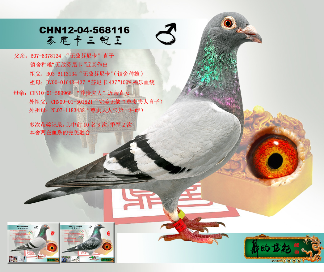 本舍镇舍种雄“无敌芬尼卡”最佳直子之一,本身与3羽雌鸽交配,每年均作出冠军及前10名赛鸽多羽。套比利时旧环。