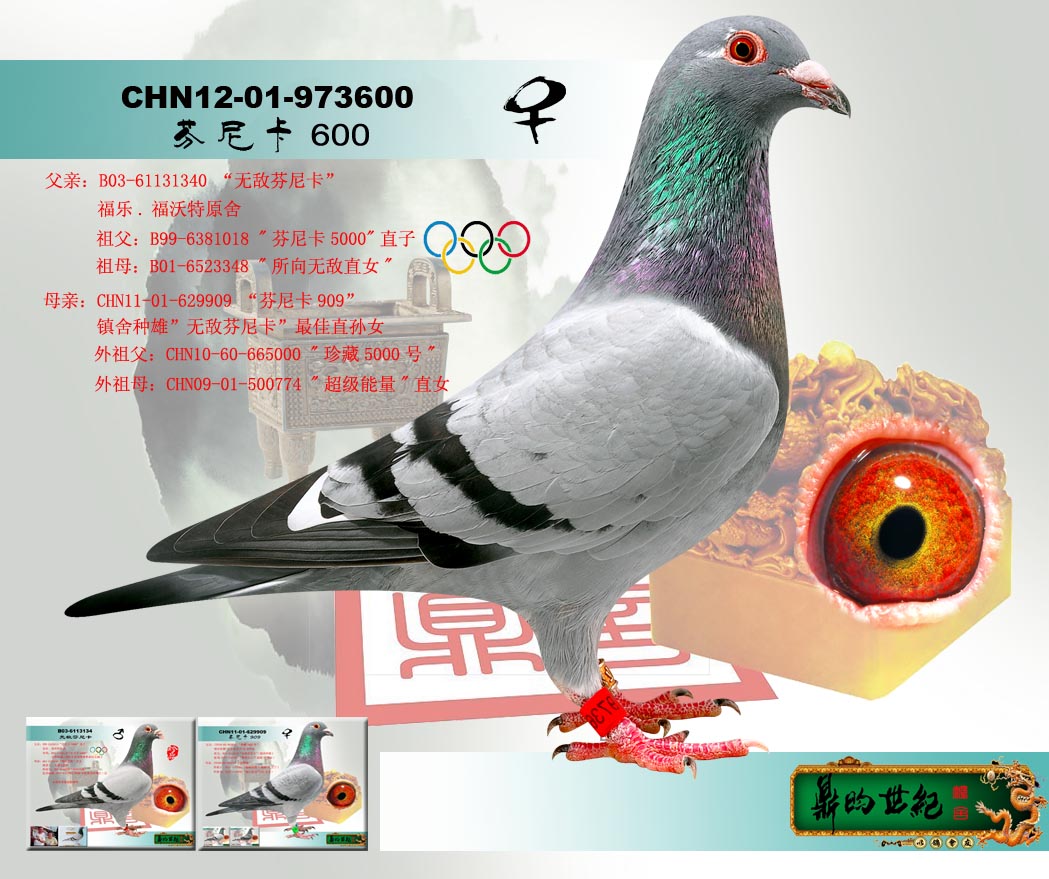 本舍第一种雄“无敌芬尼卡”X第一种雌“尊贵夫人”近亲作出直子(叔侄配),所套足环为60年大庆珍藏5000号,2012年春节期间意外被黄鼠狼咬死,痛失爱鸽。