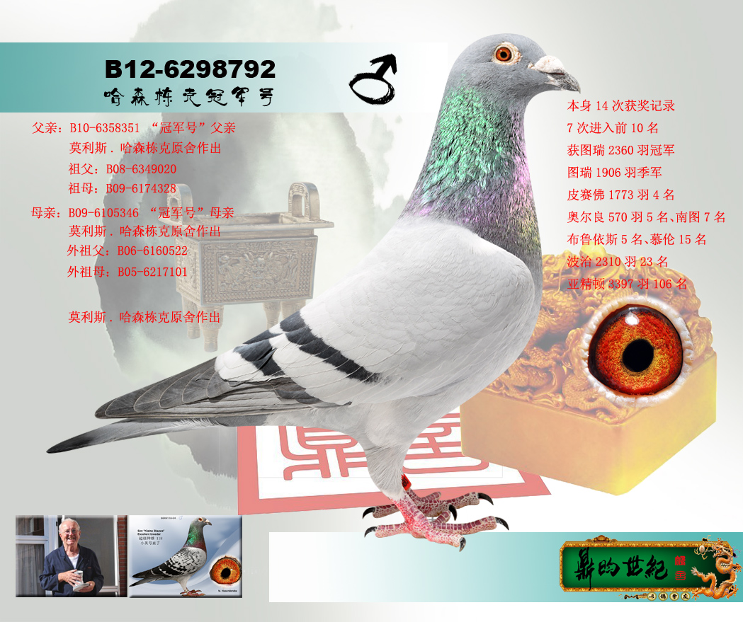 本身14次获奖记录,7次进入前10名。荣获图瑞2360羽冠军、图瑞1906羽季军、皮赛佛1773羽4名、波治2310羽23名、亚精顿3397羽106名、奥尔良570羽5名、南图7名、布鲁依斯5名、慕伦1959羽15名等。